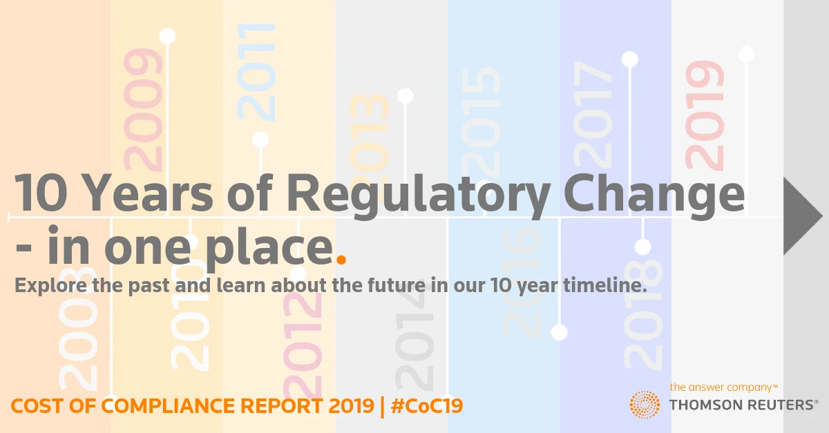 The annual Thomson Reuters Cost of compliance report has become a trusted voice for compliance practitioners worldwide. Over the 10-year lifetime of the report, there have been almost 6,000 survey participants from firms, global systemically important financial institutions, regulators, law firms, domestic governments and consultancies. The responses from these almost 6,000 participants have been used to create the Thomson Reuters regulatory change interactive timeline – which correlates and explains key regulatory events with the report’s findings from the past 10 years.