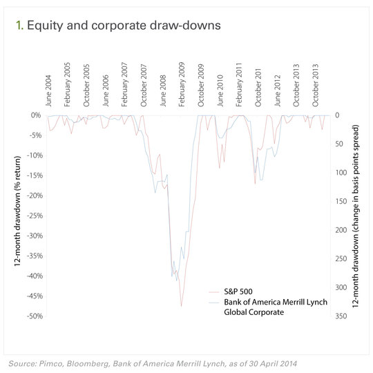 Based on our risk analysis, we conclude equity puts are the most direct and effective hedges for such a portfolio. While this is obviously the case for the equity risk, it is also true for the credit component, for two reasons. Firstly, there is no liquid market in puts on corporate bonds or corporate bond indexes. There are puts and other derivatives on credit default swap indexes, but liquidity is generally poor for longer-option maturities and basis risk is meaningful. Secondly, in tail events, the correlation between bond and equity markets increases dramatically, making equity puts an effective hedge for tail risk in corporate bonds (figure 1).