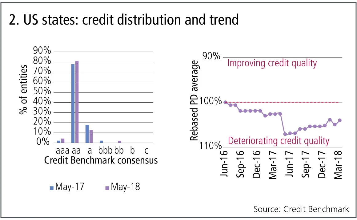 Averages can be concealing as well as revealing, of course, and it’s worth noting that the credit distribution for US states has widened, now stretching from aaa to bb.