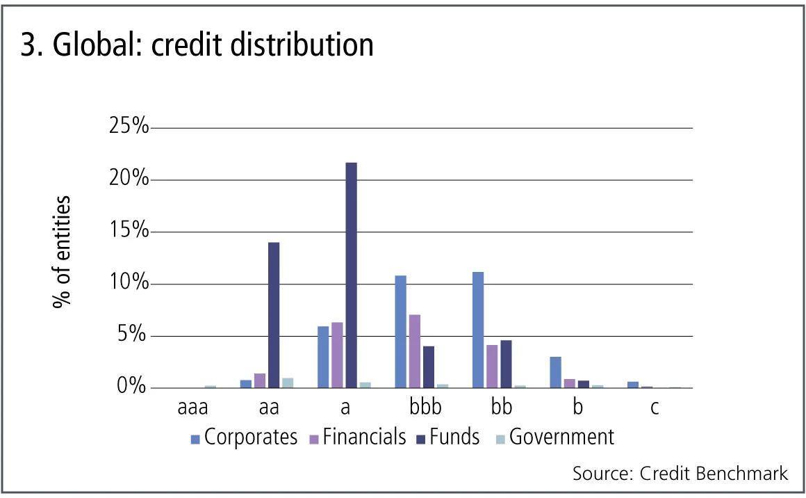 Figure 3 is based on bank-sourced estimates for around 20,000 corporate, financial, fund and government borrowers across the globe, and plots the distribution of the entities across the seven-category credit benchmark consensus scale.