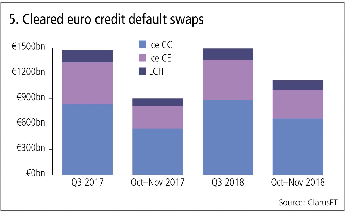 US dollar credit default swaps and euro interest rate swaps in particular have had a strong end to the year. The latter saw a 176% increase in volumes at Eurex and 63% at LCH in October-November 2018 versus 2017.