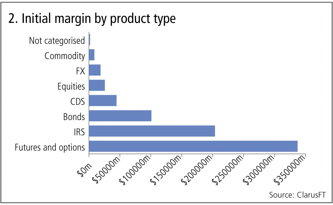 Futures and options together account for the largest IM amount by product type, but LCH SwapClear emerges as the largest single clearing service with $159 billion of IM. Clearing can be a lumpy business – the top three services together account for 43% of IM.