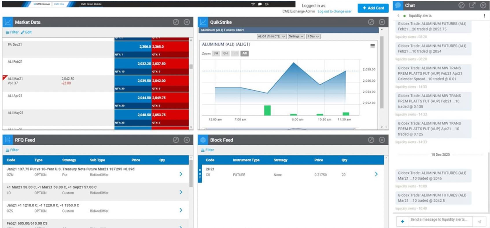 Transparency in trading is key, and Commodity Direct via CME Chat allows users to chat directly with Platts editors and other CME Chat participants to discuss the Aluminum MW US Transaction Premium (Platts) futures market activity.