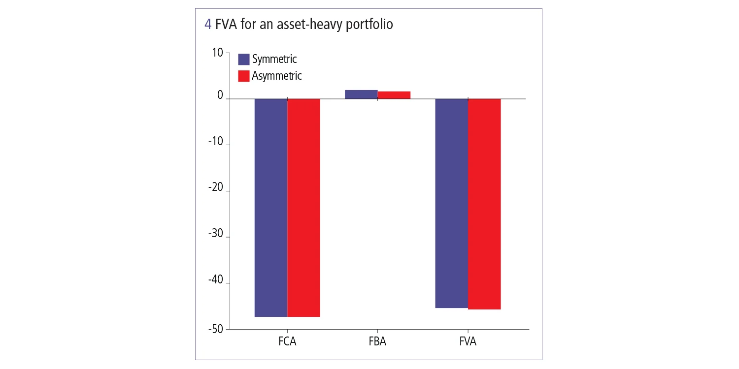 There is only around 1% difference between symmetric and asymmetric funding for the asset-heavy portfolio. This result stems from the fact the FCA, which uses the borrow spread, dominates over the FBA, which uses the lending spread – meaning its sum (the FVA) is mostly FCA.