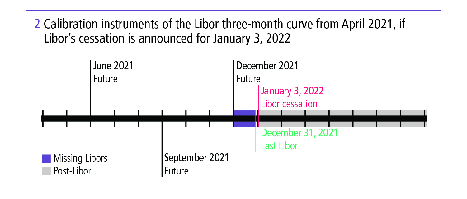 Let’s take the example of the three-month USD Libor curve. Typically, the short term of the curve will be made of future quotes. Assuming Libor ceases on January 3, 2022, the last instrument of the Libor three-month curve is going to be the December 2021 future. This instrument will mark the December 15, 2021 Libor level, but what about three-month Libor levels between this date and January 3, 2022?
