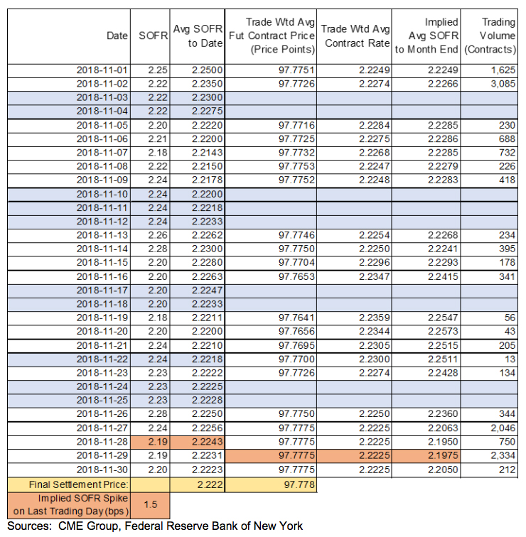 - Given the calendar configuration of November 2018, and given the SR1 product rules governing assignment of daily SOFR values to weekend days and US government securities market holidays, the value on the last day of the month — no matter how large or small — was destined to be limited in impact to 1/30th of the month-average level.