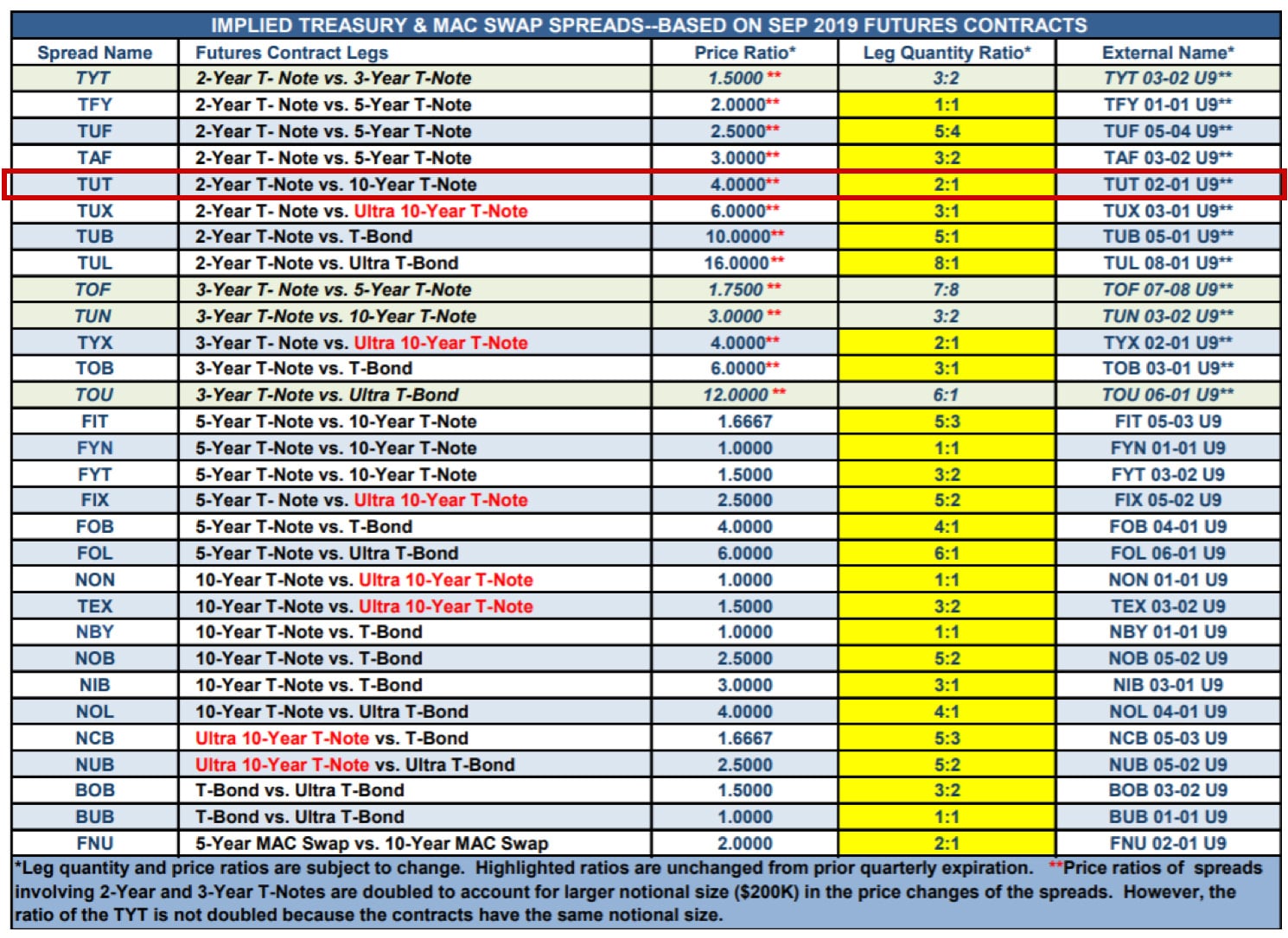 Encircled in red is the 2-Year T-note vs. 10-Year T-Note spread. The price ratio is calculated to be 4:1 (4 2-yrs contracts vs. 1 10-yr contract). However, the 2-Year T-Note contract is twice the size in notional value as the 10-Yr T-note thus lowering the ratio to 2:1. The details of the trade are laid out below.