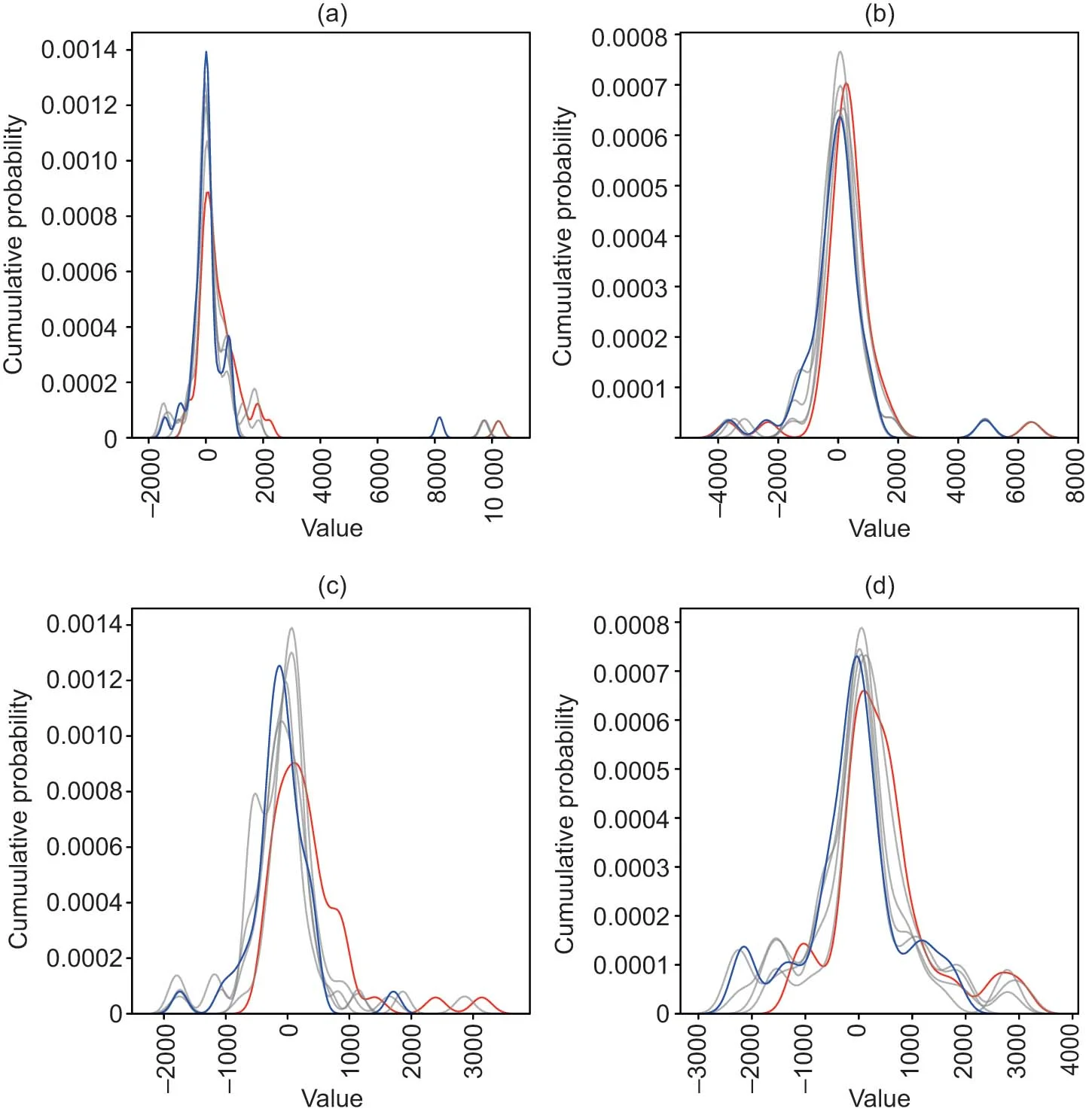 Figure 2 shows the probability density of the event strategy for tradable products for HH0 and HH1 during the summer and winter periods. Kernel density estimation is used for smoothing the probability density, since these plots have been created from a discrete data set. The red line indicates the distribution for a reaction time of 0s, and the blue line a reaction time of 50s (with gray lines showing variations in reaction times between these values). The horizontal axis displays the single-instance profitability of the strategy compared with VWAP, and the vertical axis shows the probability density of achieving such a profit or loss. The area under the curve to the right or left of the zero value (considering that slices of the plot should be weighted according to their value) can be used as an indicator of the average profitability of the strategy.