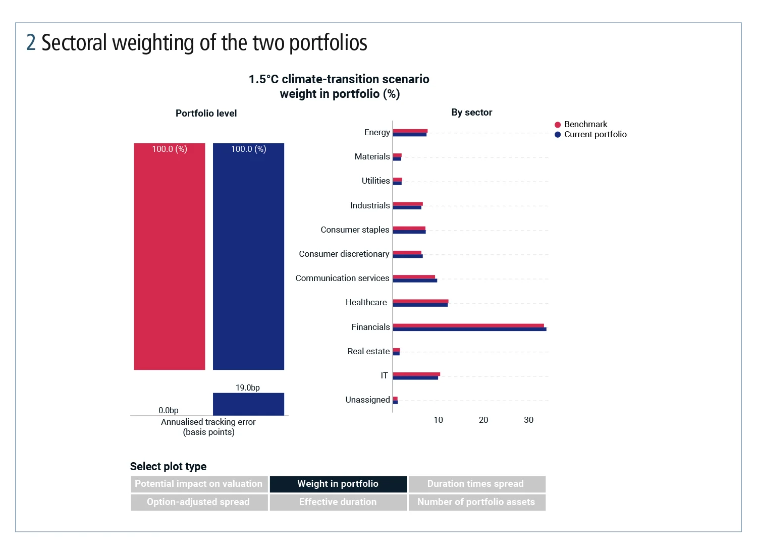 The hypothetical client bond portfolio had the MSCI US Dollar Investment Grade Corporate Bond index as its underlying benchmark. After running the 1.5ºC climate scenario, it could be seen that both the client’s portfolio and the benchmark registered losses (see figure 1). While the benchmark fell by 3.12%, the client’s portfolio fared worse with a loss of 3.41%.