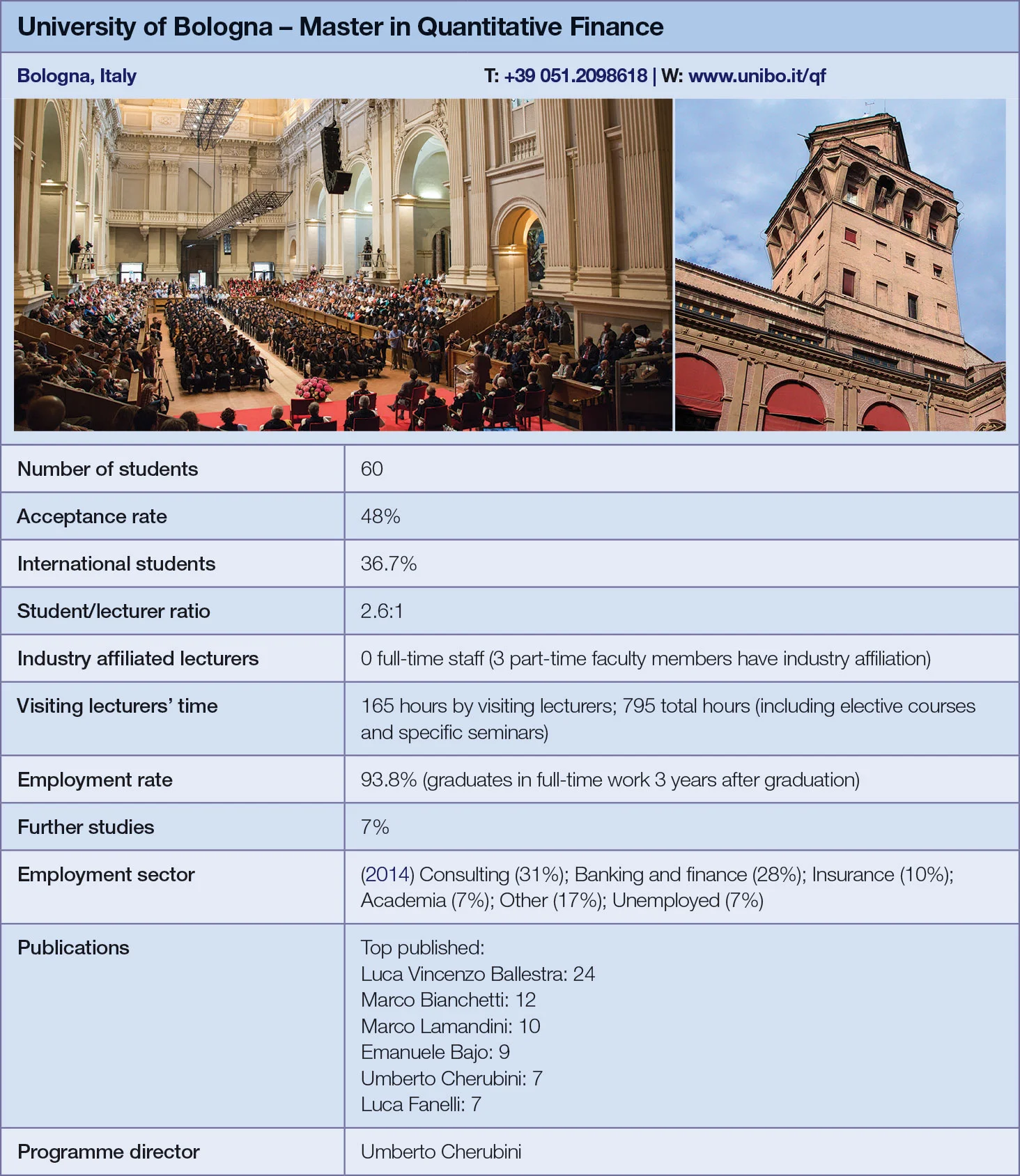 In designing its English-language master’s in quantitative finance, the University of Bologna put practitioners at the heart of the process from the start. Their advice led to the introduction of four career-based tracks when the course was launched in 2010: students can specialise either in the pricing of financial products, asset management, risk management – including hedging and capital allocation – or insurance products and actuarial risks.
