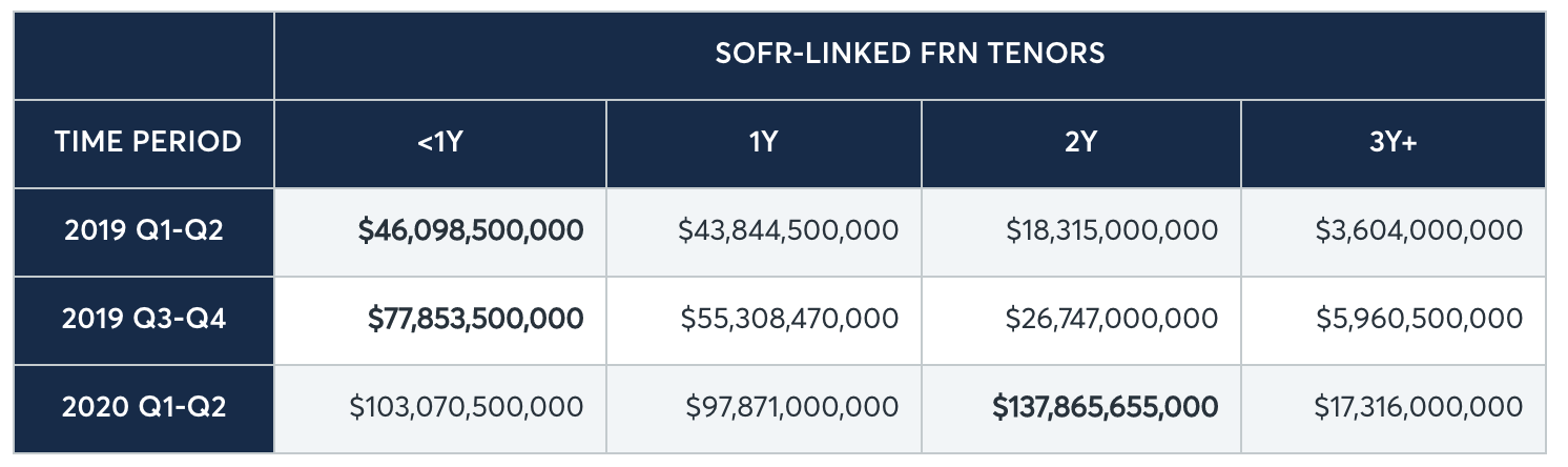 After building tremendous momentum in autumn 2019, SOFR floating rate note (FRN) issuance saw a slowdown in winter, only to surge to new highs in Q1 and Q2 2020.