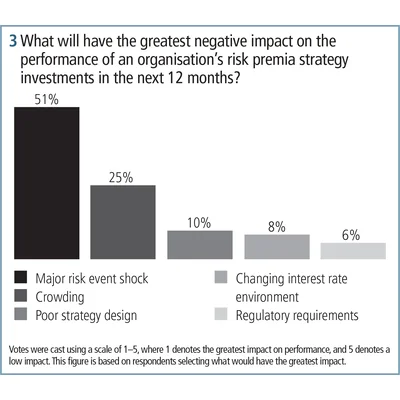 Indeed, the survey results show that only 8% of respondents see the changing interest rate environment as the top risk factor in relation to future performance of risk premia strategy investments. On the other hand, more than half (51%) ranked a major risk event shock as the number one scenario likely to negatively impact the performance of their organisation’s risk premia strategy investments over the next 12 months (figure 3).